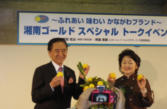 そごう横浜店特設会場にて黒岩知事と斉藤美穂が県特産品である湘南ゴールドの魅力についての講演をおこないました。 当日はミホ・シェフ・ショコラティエの「湘南ゴールドとイチゴのヴェリーヌ」を知事に召し上がって頂きました。